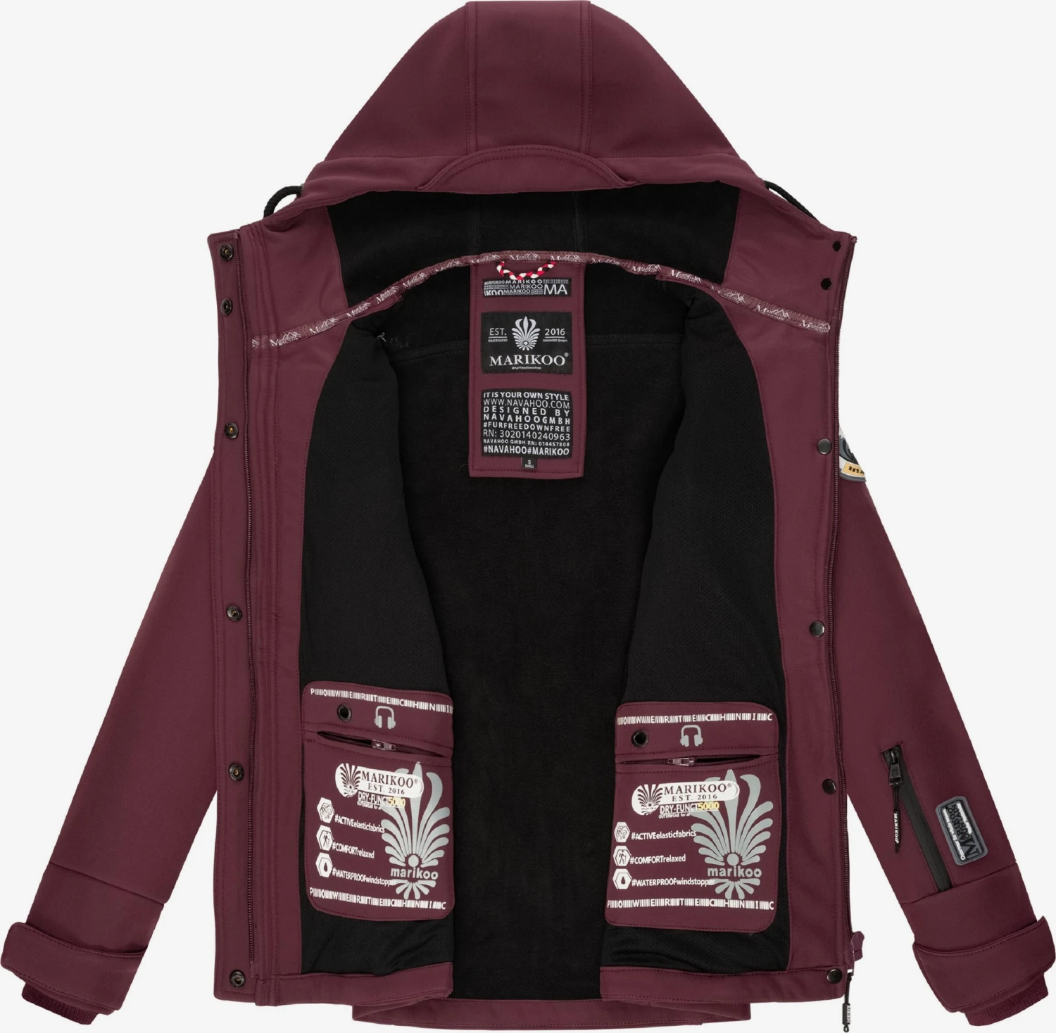 EffenSoftshellSoftshell jasRitsvak binnenDrukknopenGevoerde capuchonGetailleerd modelVerborgen ritsMouwzakBorstzakOpzet-/flapzakZakken aan de zijkantFleece binnenvoeringLabel patch/label flagLabel borduurwerkGladde stofStevige stofMet capuchonLicht gevoerdDrukknoop